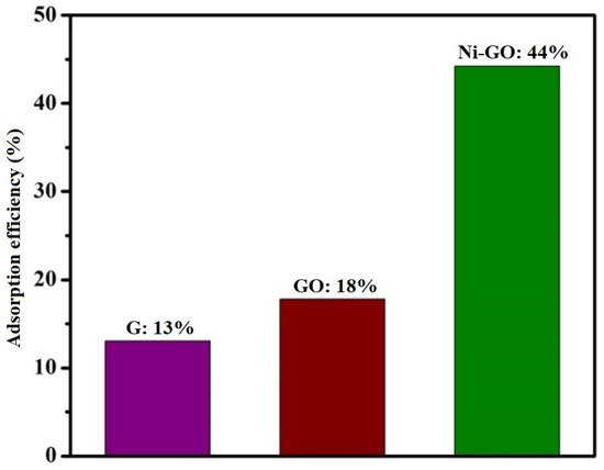 Graphite and modified-GO showed minimal degradation of RhB in dark conditions, in which the degradation efficiency was measured as 13% and 18% (as shown in Figure 10), respectively. Adsorption efficiency of the as-prepared Ni-GO composite was 44%. This indicated that RhB can easily interact with the Ni-GO composite surface. This adsorption capacity may influence the degradation efficiency in light irradiating systems. Therefore, we expected high photo catalytic efficiency for the Ni-GO sample.