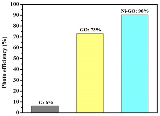 Graphite presented fair activity for the degradation of RhB under sunlight irradiation, in which the degradation efficiency was 6%. Prepared GO showed more activity, nearly 73%, and the Ni-GO composite showed 90% degradation of RhB under sunlight irradiation. The differences were nearly 84% and 17% compared to G and GO samples, respectively, even with an irradiation time of 90 min.