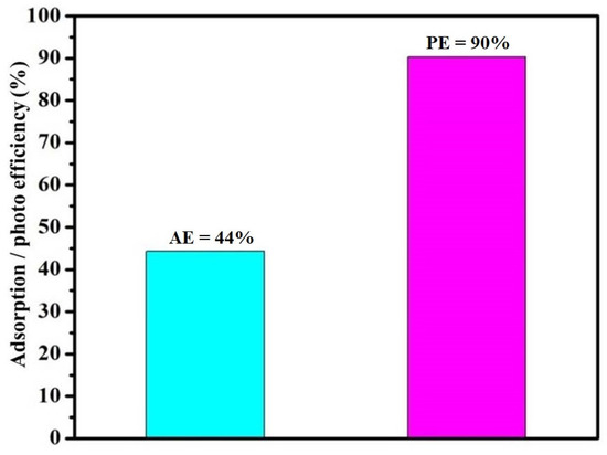 Bar diagram comparing the adsorption and photocatalytic efficiencies of the Ni-GO nanocomposite.