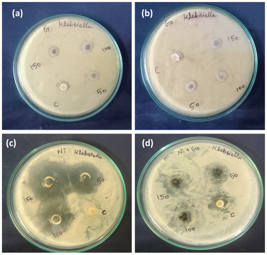 We evaluated several metal complexes, including [Ni(bipy)3]Cl2·5H2O, graphite, graphene oxide, and nickel-modified GO, for their antimicrobial activity against Klebsiella, and the results are presented in Table 2. Among all the samples tested, the Ni(II)-bipyridine complex exhibited higher biological activity compared to the other nanocomposites. The order of biological activity was as follows: Ni(II)-complex > Ni-GO > G > GO.