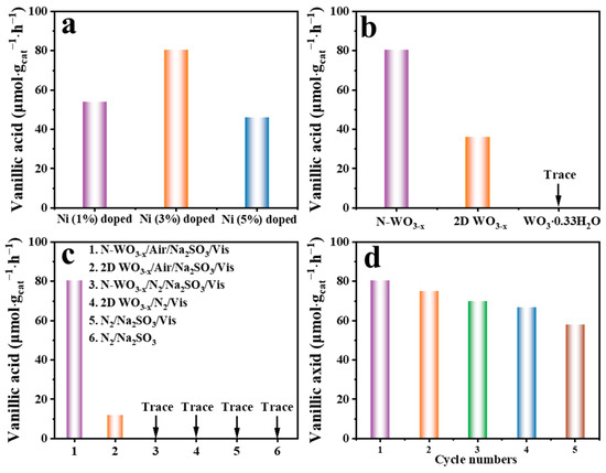 The photocatalytic activity of all samples was evaluated through the experiment of photocatalytic depolymerization of sodium lignosulfonate as a high-value chemical. The results are shown in Figure 4. The depolymerization ability of the photocatalyst to sodium lignosulfonate first increases and then decreases when 3% Ni was doped into WO3-x (N-WO3-x), which has the best ability of photocatalytic depolymerization of sodium lignosulfonate. When the illumination time was 60 min, the depolymerization rate of sodium lignosulfonate was 80.24% (Figure 4a). In addition, compared to 2D WO3-x and WO3-x∙0.33H2O, N-WO3-x also exhibited the highest catalytic activity (Figure 4b,c), which could be ascribed to how the appropriate concentration of Ni doping and oxygen vacancy can enhance the activity of the photocatalyst [35]. The scientific control in different atmosphere environments confirmed that molecular oxygen participated in the catalytic reaction and assisted in the depolymerization of lignin. Figure 5d shows that the cycling experiments also exhibit stable photocatalytic performances of N-WO3-x during five cycles (Figure 4d). Thus, WO3-x, with an appropriate concentration of Ni-doped and rich in oxygen vacancies, can increase the absorption capacity of light and make full use of sunlight [26,36]. The existence of oxygen vacancies can accelerate the separation of photogenerated electrons and holes, promote the formation of superoxide radicals, and improve the catalytic performance of photocatalysts.