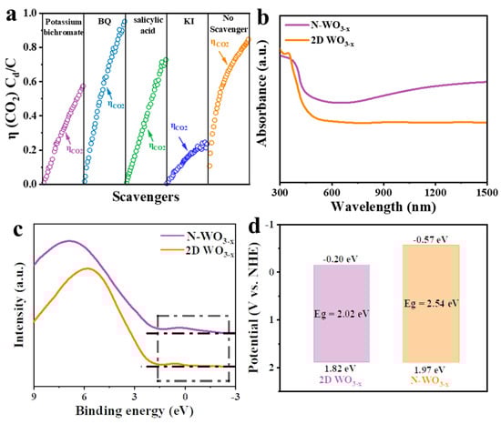 To study the role of active radicals in the process of photocatalyst reaction, the active species were tested and analyzed by free radical capture experiment. The results are shown in Figure 6a. It showed that when p-benzoquinone, triethanolamine, and tert-butanol were added to the reaction system, the degradation rate of sodium lignosulfonate decreased to a certain extent. Among them, the degradation rate of sodium lignosulfonate decreased most significantly after the addition of tert-butyl alcohol, indicating that the photocatalytic reaction system was a free radical reaction mechanism with the hydroxyl radical as the main component and the photogenic hole and superoxide radical as the auxiliary component. The optical absorption performance of the synthesized sample was analyzed by a UV-Vis diffuse reflectance spectrometer, and the results are shown in Figure 6b. It shows that all photocatalysts have the ability to absorb ultraviolet light. Compared with 2D WO3-x, N-WO3-x shows a slight redshift and a significant tailing phenomenon at the wavelength of 400 nm, which may be caused by Ni doping and the formation of oxygen vacancies [26,34,35]. On the other hand, as shown in Figure 6c, comparing to the binding energy of 2D WO3-x, that of at about 0 eV was attributed to the doped Ni2+, which changed the electronic structure of the sample [36,37,38,39], which also proves that the Ni element was doped into the lattice of WO3-x. The valence bands of the N-WO3-x and 2D WO3–x were 1.97 and 1.82 eV, respectively. Thus, the conduction band potentials of the N-WO3-x and 2D WO3–x were calculated to be −0.20 and −0.57 eV, respectively, according to the formula Eg = EVB–ECB. The band structure of the N-WO3-x and 2D WO3–x is clearly depicted in Figure 6d. Obviously, the conduction band edge of N-WO3-x moved in a more negative direction, which promoted the combination of N-WO3-x and O2 to form superoxide radicals, which is consistent with the results of the free radical capture experiment.