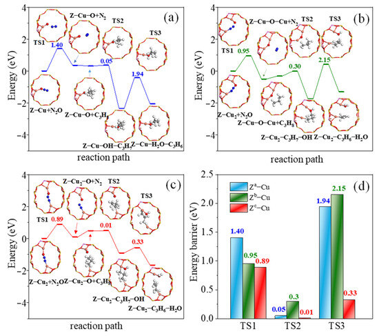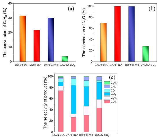 As for the samples of 1%Fe-BEA and 1%Fe-ZSM-5, the nearly complete N2O conversion (~100%) can be achieved due to the superior N2O dissociation activity of Fe cations than those of the Cu cations [23], although this does lead to the ready overoxidation of C3H8 into COx (CO and CO2 of 64.1 and 46.0%, respectively; see Figure 7c). This finding shows that the Fe cations are active for N2O dissociation, although they suffer from the overoxidation of C3H8. The Cu-based zeolites would therefore probably be much more suitable for the N2O-ODHP relative to that of the Fe-based zeolite catalyst. However, we would also like to emphasize that such works still need further investigation. We would also like to note that the TPR and UV-vis correlate with the active-site-structure in the theoretical calculation. This will be further studied in our research in the future, which will focus on the influence of a diversely structured topologized zeolite (MFI, FER, MOR, and BEA) on a specific structure, as well as on the location of [Cu]+ cations and how they are related to N2O-ODHP catalytic behaviors, both experimentally and theoretically.