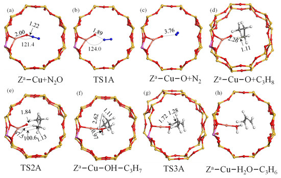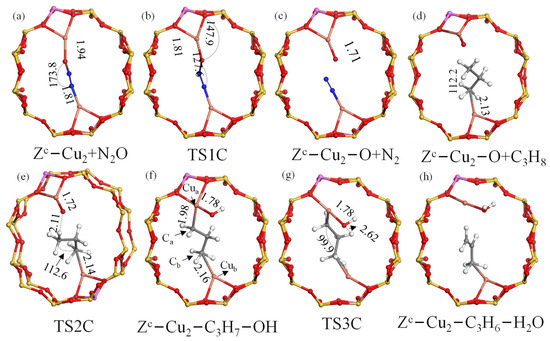 Optimized model of Cu-BEA with Zc−Cu site for the N2O-ODHP: (a) Zc−Cu2+N2O (adsorption fo N2O); (b) TS1C; (c) Zc−Cu−O−Cu+N2; (d) Zc−Cu2−O+C3H8 (adsorption of C3H8); (e) TS2C; (f) Zc−Cu2−C3H7−OH; (g) TS3C; (h) Zc−Cu2−C3H6−H2O. Si (yellow), O (red), N (blue), Al (pink), Cu (orange).