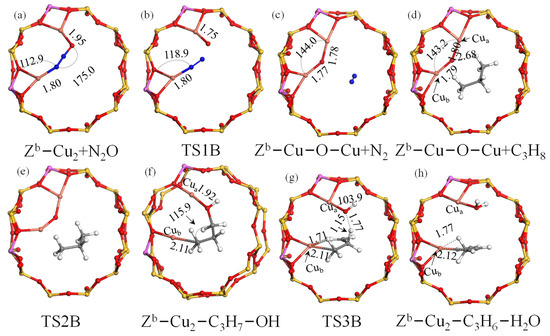Optimized model of Cu-BEA with Zb−Cu site for the N2O-ODHP: (a) Zb−Cu2+N2O (adsorption fo N2O); (b) TS1B; (c) Zb−Cu−O−Cu+N2; (d) Zb−Cu−O−Cu+C3H8 (adsorption of C3H8); (e) TS2B; (f) Zb−Cu2−OH−C3H7; (g) TS3B; (h) Zb−Cu2−C3H6−H2O. Si (yellow), O (red), N (blue), Al (pink), Cu (orange).