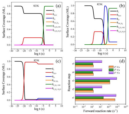 Microkinetic modeling results: the surface coverage variations along with reaction time (t) over the (a) Za−Cu, (b) Zb−Cu, and (c) Zc−Cu sites of Cu-BEA at 823 K, and (d) the forward reaction rate comparisons.