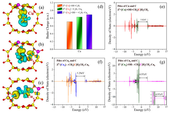 The static charge difference (a–c) and partial density of state (PDOS) analyses (e–g) of TS3 models for Za−, Zb−, and Zc−Cu-BEA; (d) bader charges analysis results; (e) partial density of state (PDOS) of atomic Cu and C over (e) Za−Cu; (f) Zb−Cu; and (g) Zc−Cu site. Yellow and blue colors represent the increase and decrease in electron density, respectively. Si (yellow), O (red), N (blue), Al (pink), Cu (orange).