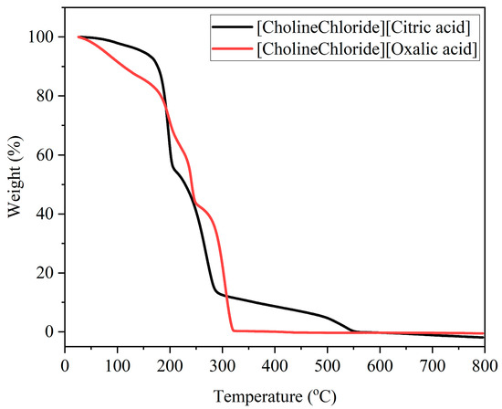 Thermogravimetric analysis (TGA) was used to examine the stability of deep eutectic solvents, including [CholineCl][Citric acid] and [CholineCl][Oxalic acid], as depicted in Figure 2. According to the data provided by the TGA, the mass does not change much (approximately 10%) even at the first thermal decomposition step when the temperature is raised to 130 °C; nevertheless, previous work [27,28,30] has shown that when the temperature is increased from 200 °C to 300 °C, this fully disintegrates. At the final thermal degradation step, [CholineCl][Citric acid] completely decomposed in the temperature range from 300 °C to 450 °C, while the structure of [CholineCl][Oxalic acid] completely decomposed above 300 °C. Therefore, with the temperature that our study determined, the DES was still stable and had not decomposed. Moreover, 1H NMR and 13C NMR were used to identify DESs, which provided detailed Supporting information.