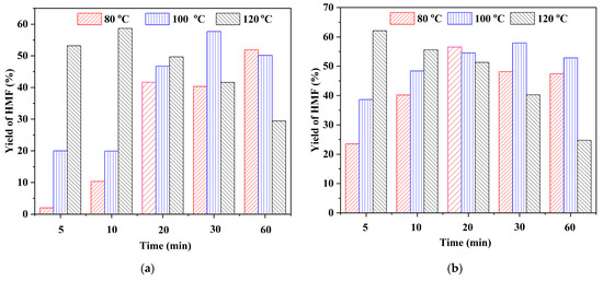 Effect of temperature on HMF conversion. (a) [CholineCl][Citric acid], (b) [CholineCl][Oxalic acid]. Reaction conditions: fructose (1 mmol), DESs (5 mmol), over various reaction times (5, 10, 20, 30, and 60 min, respectively).