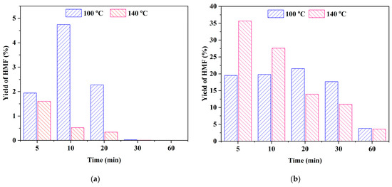 The production of HMF was limited by low selectivity and yield, particularly from glucose or cellulose substrates. Thus, various pathways have been studied as processes for preparing DFF from glucose or cellulose using different catalysts under various conditions. Therefore, the use of several DESs has recently been investigated for their potential as catalysts for biomass-to-HMF conversion. As shown in Figure 7, we evaluated the conversion of glucose to HMF using two different DESs (quaternary ammonium salt/metal chloride hydrate and quaternary ammonium salt/hydrogen bond donor). The HMF yield of the [CholineCl][Oxalic acid] solvent was very low at both temperatures, with the highest at 100 °C (5%). However, as the reaction time and temperature increased, the yields of HMF were reduced. This can be explained by the weak and easy decomposition of hydrogen bonds in these DESs at high temperatures. On the other hand, the obtained HMF yield in the [CholineCl][CrCl3] was significantly higher than from the previous DESs. At 100 °C, the HMF yield obtained was 19% after just 5 min. Furthermore, increasing the temperature to 140 °C (36%) for 5 min improved performance significantly. This type of DES is made up of coordination bonds to form a stable Cr3+ complex.