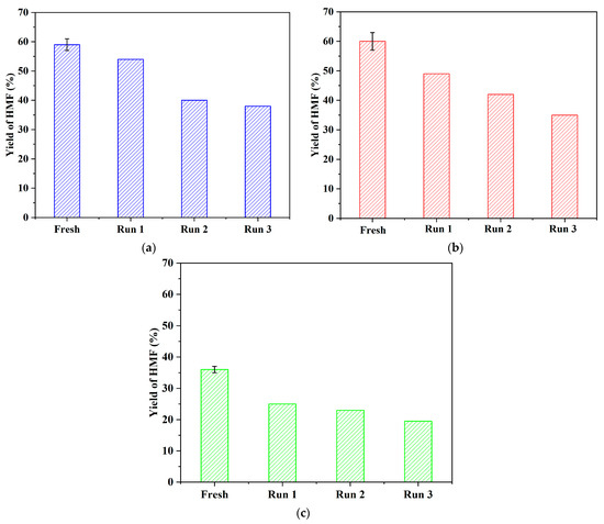 A recycling test of DESs was necessary for industrial processes. Thus, the recycling tests were carried out under optimal conditions with fructose (1 mmol, 180 mg) and [CholineCl[Citric acid] or [CholineCl][Oxalic acid] (5 mmol), for 10 min at 120 °C, and glucose (1 mmol, 180 mg) and [CholineCl][CrCl3.6H2O] (5 mmol), for 5 min at 140 °C. The results are shown in Figure 8. After completion of the reaction, the desired HMF was separated using a 1:1 mixture of diethyl ether and ethyl acetate (6 × 5 mL). The HMF yield of DESs produced from organic acids declined dramatically over the reusability periods (approximately 5–10%). This is due to the fact that when the reaction creates water, the water content of the DESs increases, and these DESs deteriorate with time, lowering the product conversion activity. The HMF yield was also somewhat lowered while utilizing DESs [CholineCl][CrCl3.6H2O] over reuses. This might be attributed to a reduction in the activity of the solvent or to a variation in the amount of fresh glucose added each time for [CholineCl][CrCl3.6H2O]. The reuse of the DES in these experiments caused the DES to degrade after it was recovered. In general, the reaction system can be reused up to three times, with a third yield of around 40% for [CholineCl][Citric acid], 35% for [CholineCl][Oxalic acid], and 20% for [CholineCl][CrCl3].