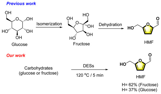 Due to the rapid depletion of fossil fuel sources and increasing global warming concerns, the study of alternative biofuels and value-added chemicals from sustainable resources has attracted more attention [1,2,3,4]. As a result of these problems, scientists from all over the world are working to find and develop new, clean, and safe energy resources in order to reduce reliance on fossil fuels. Carbohydrates are a promising replacement for fossil resources in the production of valuable chemicals and fuel components because they are renewable resources. Among many types of high-value chemicals, 5-hydroxymethylfurfural (HMF) is one of the most promising alternative chemicals because it is an important building block for conversion into valuable derivatives, such as 2,5-dimethylfuran, 2,5-diformylfuran, 1,6-hexanediol, and levulinic acid [5,6,7,8,9]. The most straightforward route to produce HMF is via direct conversion from fructose due to its high yield and selectivity. Carbohydrate sources such as glucose or cellulose are preferred for the synthesis of HMF. Recently, the synthesis of HMF from carbohydrates has received significant attention. For example, Ly et al. demonstrated the continuous conversion of fructose into HMF in a home-built continuous flow system employing conventional homogeneous acid catalysts such as p-TsOH and Brønsted acidic ionic liquid. An HMF yield of 46% was obtained for p-TsOH/DMSO at the temperature of 130 °C within 5 min [10]. Souzanchi and co-workers reported niobium phosphate, synthetic sulfated niobium, and Amberlyst 36 were active and selective, resulting in HMF yields of 54–60% under ideal working conditions [11]. However, mineral acids involve equipment damage, energy costs, and environmental difficulties. To reduce negative environmental impacts, the study of deep eutectic solvents (DESs) as a catalyst has attracted scientists. DESs are composed of massive, nonsymmetric ions with low lattice energy and, as a result, low melting points. They are typically synthesized by complexing a quaternary ammonium salt with a metal salt or hydrogen bond donor (HBD). The charge delocalization caused by hydrogen bonding between, for example, a halide ion and a hydrogen-donor moiety is responsible for the mixture’s lower melting point in comparison to the melting points of the separate components [12]. DESs usually have lower thermal stability and leach more easily, but are less costly and easier to prepare than ionic liquids. At present, DESs have received much attention in the conversion of carbohydrates into HMF [13,14,15,16]. Chen et al. reported using sulfuric acid and DES catalyst systems to convert glucose into HMF under optimal conditions with an efficiency of 34.86%; however, the use of liquid catalyst makes it challenging to recover and reuse the catalyst system [17]. Vigier et al. (2012) examined the influence of natural deep eutectic solvents (NADESs) based on betaine hydrochloride on fructose dehydration. A mixture of betaine hydrochloride, choline chloride, and water (10/0.5/2) generated the highest HMF yields from fructose (84%) and inulin (52%) at 110 °C for 1 h [18]. In 2017, Delbecq et al. investigated HMF production using a water/MIBK biphasic system with a combination of betaine and formic acid as a catalyst. From fructose, the yield of HMF obtained was 82% at 160 °C for 60 min; from starch, 45% at 190 °C for 60 min; from glucose, 55% at 190 °C for 60 min; and from microcrystalline cellulose, 26% at 200 °C for 80 min [19]. Low yield and difficulty in product separation are two issues that arise throughout the process of converting glucose into HMF [20,21,22,23]. Glucose undergoes isomerization to form fructose, then fructose dehydration to form HMF (Scheme 1). Therefore, converting glucose into HMF has proven to be challenging due to the fact that the product of the reaction creates a by-product, which causes the yield to drop and results in a lack of selectivity.