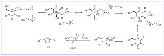 The conversion of glucose into HMF is composed of two processes, including the isomerization of glucose to fructose and the dehydration of fructose to HMF. The mechanism for fructose conversion into HMF through dehydration has been reported in previous literature [14,21,32]. In this work, we strongly proposed the mechanism for glucose conversion into HMF using [CholineCl][CrCl3.6H2O] as a catalyst (Scheme 2). Direct coordination of glucose with the Lewis acidic sites of CrCl3 supports the open-ring form of glucose. Moreover, Cr3+ complexes temporarily self-organize into dimers during the catalytic process, which aids in the glucose-to-fructose isomerization phase that ultimately determines HMF selectivity. In order to produce high HMF yields [33,34], it is necessary to have a reaction environment that allows for the free movement of the Cr complexes and the Cl− sites [35]. Finally, fructose is dehydrated three H2O molecules under the influence of [CholineCl][CrCl3.6H2O] to form HMF.