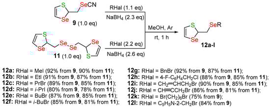 The reaction of NaBH4 with selenocyanate 9 or diselenide 11 in methanol at room temperature afforded sodium 1,3-thiaselenol-2-ylmethylselenolate, which was in situ involved in nucleophilic substitution reactions with organohalogen compounds, bearing alkyl, benzyl, allyl, 2-propynyl, 2-pyridylmethyl, and 4-fluorobenzyl groups. The products 1,3-thiaselenol-2-ylmethyl selenides 12a–l were obtained in high yields (75–92%) and in a regioselective manner (Scheme 6) [77].