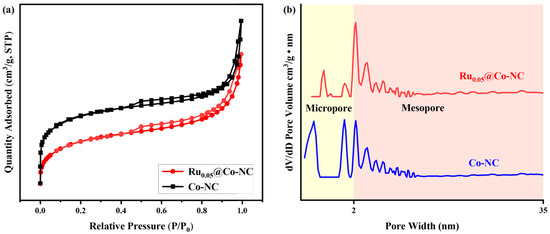 On the other hand, the pore structure and properties of Ru0.05@Co-NC were examined using the Brunauer Emmett Teller (BET) method to determine the specific surface area and pore size. The N2 adsorption and desorption curve for Ru0.05@Co-NC, as shown in Figure 4a, indicated that this material had strong adsorption capacity at low pressure (P/P0 < 0.05), and a hysteresis loop was also observed at high pressure (P/P0 = 0.8–0.99). The curve is of the type IV isotherm, indicating that the material is mainly microporous with some mesopores. The presence of these pore structures facilitates the operation of substrate molecules and their interaction with the active catalytic centers, thus promoting this catalytic process [48]. Subsequently, the pore size distribution of the materials was explored and shown in Figure 4b. It was also observed that the curve of Co-NC was similar to that of Ru0.05@Co-NC, which indicated that the pore structure of Co-NC was inherited despite the replacement of some Co species by Ru during the synthesis of Ru0.05@Co-NC. The results showed that the micropore percentage of Ru0.05@Co-NC was reduced compared with that of Co-NC, whereas the mesopore percentage of Ru0.05@Co-NC was slightly higher than that of Co-NC. The possible reason is that the involvement of Ru occupied some of the micropores in the precursor material [49]. Furthermore, the specific surface area, pore volume, and pore diameter of the Ru0.05@Co-NC and Co-NC material were determined (as outlined in Table S4), which illustrated that the introduction of Ru led to a decrease in the specific surface area and increases in pore volume and pore size. Probably, the incorporated Ru species could occupy the micropores of the precursor material (Co-NC). The decrease in the specific surface area is generally regarded as an indication of successful Ru introduction, while the occupation of the micropores also enhances the pore volume and pore size [49].