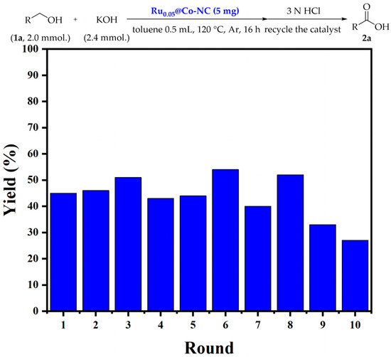 Subsequently, the recovery and recycling of Ru0.05@Co-NC were carried out by utilizing the conversion of 1a into 2a for the investigations. To better demonstrate the recyclability of Ru0.05@Co-NC, the selected conditions (with more substrates and a shorter reaction time compared to the standard conditions) were utilized to ensure a product yield of no more than 50% for the first catalytic cycle. As shown in Figure 5, it was gratifying that the catalyst displayed continued recyclability for eight cycles, with each cycle producing 2a in a reliable moderate yield. Moreover, it was observed that 1 mg of Ru0.05@Co-NC effectively produced 183 mg of 2a after eight cycles, almost twice as much as the value from Co-NC (90.9 mg) after nine cycles (Figure S1) [23]. These findings highlight the significant potential of the Ru0.05@Co-NC catalyst for further studies and applications.