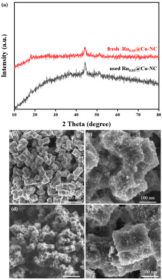 (a) XRD diffractograms of fresh Ru0.05@Co-NC and used Ru0.05@Co-NC; SEM images of (b,c) fresh Ru0.05@Co-NC,(d,e) used Ru0.05@Co-NC.