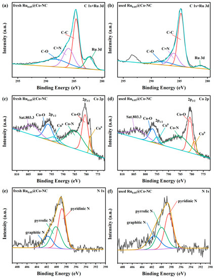 XPS spectra in C1s+Ru 3d of (a) fresh Ru0.05@Co-NC and (b) used Ru0.05@Co-NC; (c) Co 2p of fresh Ru0.05@Co-NC and (d) used Ru0.05@Co-NC; N 1s of (e) fresh Ru0.05@Co-NC and (f) used Ru0.05@Co-NC.