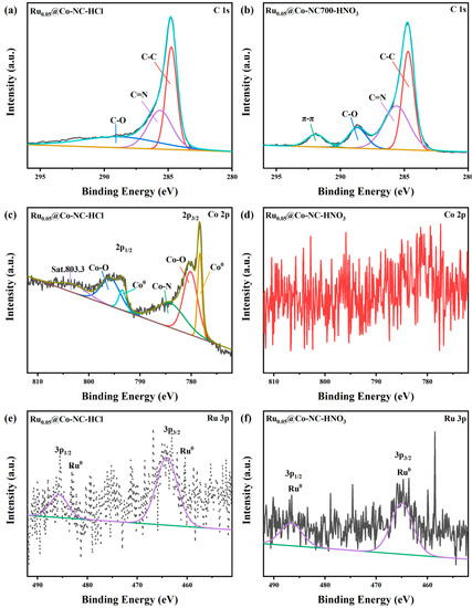 XPS spectra in C 1s + Ru 3d of (a) Ru0.05@Co-NC-HCl and (b) Ru0.05@Co-NC-HNO3; Co 2p of (c) Ru0.05@Co-NC-HCl and (d) Ru0.05@Co-NC-HNO3; Ru 3p of (e) Ru0.05@Co-NC-HCl and (f) Ru0.05@Co-NC-HNO3.