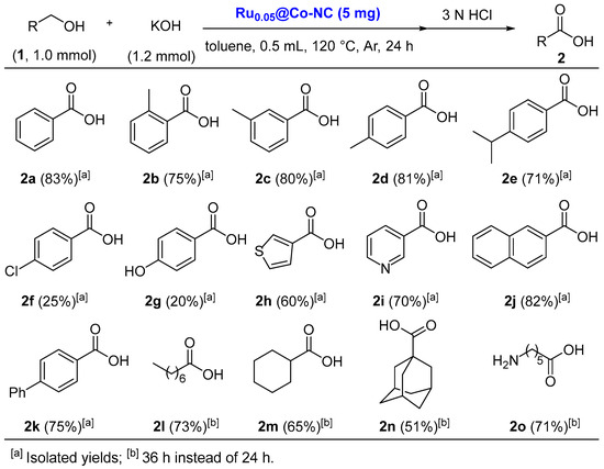 In a 25 mL Schlenk tube, Rux@Co-NC (5 mg), KOH (67.3 mg, 1.2 mmol), benzyl alcohol (104 μL, 1.0 mmol), and toluene (0.5 mL) were added. The tube was placed under an argon atmosphere and then heated at 120 °C for 24 h. Once the mixture was cooled to ambient temperature, the catalyst was separated with a magnet, and then washed with water (2 mL × 1) and methanol (5 mL × 3). The methanol solution was concentrated and combined with the aqueous solution, and the resulting mixture was acidified by a 3 N HCl solution to reach a pH value of around 2. Afterwards, the acidified mixture was extracted with ethyl acetate (5 mL × 3). The combined organic layers were dried with anhydrous Na2SO4 and concentrated under reduced pressure. Finally, the methods for determining the conversion, NMR yields, and isolated yields of all the acid products were similar with those reported in our previous work [27].