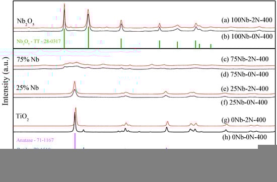 N-doping seems to have caused a modest increase in crystallinity in the sample 25Nb-2N-400 (Figure 2e), as confirmed by the crystallite sizes estimated for the 25%Nb catalysts (from 10.2 nm in the undoped sample to 16.1 nm in catalysts produced with NH4OH, see Table 1). Raba et al. reported a similar result, stating that the synthesis catalyzed in an alkaline medium tends to increase crystallites [13]. However, the crystallite size of pure TiO2 and Nb2O5 catalysts slightly decreased after N-doping.