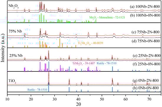 Calcination at 800 °C strongly impacted the crystalline structure (Figure 3), causing a relevant increase in crystallinity in all samples, as confirmed by de crystallite size estimations (Table 1). The anatase phase was transformed into rutile (Figure 3g,h) in the TiO2 catalyst, while the monoclinic phase (PDF#72-1121) was the main phase identified in the Nb2O5 sample (Figure 3a,b). In the present work, obtaining the Nb2O5 monoclinic phase at a relatively low temperature was possible compared to reports [50]. In the mixed oxide catalysts, two additional phases were detected: the TiNb2O7 phase (PDF#39-1407) in the 25%Nb samples (Figure 3e,f) and the Ti2Nb10O29 phase (PDF#40-0039) in the 75%Nb catalysts (Figure 3c,d).
