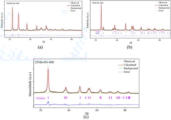 Rietveld refinement results. (a) 100Nb−0N−400; (b) 0Nb−0N−400; (c) 25Nb−0N−400.