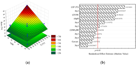 Main results of the 24-factorial design: (a) Response surface in the function of %Nb and Tcalc, pH = 5, NH4OH:M = 1. Blue dots represent the experimental results (b) Pareto chart. Red line indicates p = 0.05.