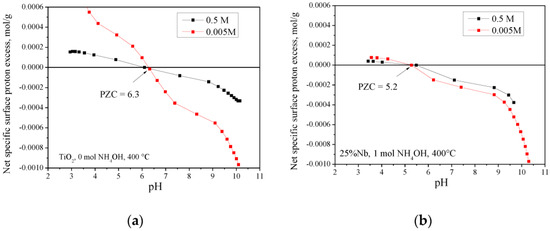 Net specific surface proton excess vs. pH functions of (a) 0Nb-0N-400 catalyst and (b) purified 25Nb-1N-400 catalyst.