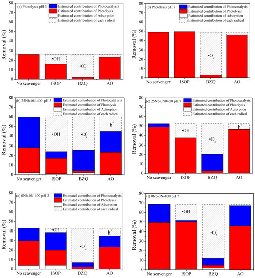 Removal percentages after 30 min of irradiation in quenching tests: (a) photolysis pH 3, (d) photolysis pH 7, photocatalysis using 25Nb-1N-400 catalyst in (b) pH 3 and (e) pH 7, and photocatalysis using 0Nb-0N-400 catalyst in (c) pH 3 and (f) pH 7.