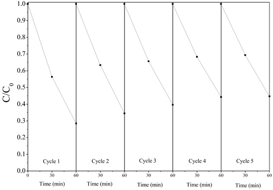 Reuse tests were carried out using the 25Nb-1N-400 catalyst, in 60 min lasting tests. At the end of each reuse cycle, a certain amount of SA stock solution was added to the medium to reestablish the initial concentration of the pollutant. The results obtained (Figure 13) indicated a reduction in the percentage of SA degradation, which became stabilized after the fourth cycle. In the last cycle, the catalyst reached only 73.9% of its degradation capacity presented in the first test. This reduction can be partly attributed to the accumulation of intermediaries formed by the degradation of the SA. The main reaction products of SA degradation by hydroxyl radicals have already been described in the literature as 2,3-dihydroxybenzoic acid, 2,5-dihydroxybenzoic acid, and catechol [63,64,65,66,67]. These compounds compete with SA for hydroxyl radicals, reducing the SA photocatalytic degradation rate.