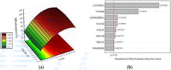 Although some catalysts have presented low specific surface areas, it is known that the adsorption capacity of a material does not depend exclusively on this property but also on the characteristics of its surface chemistry [45,46,47]. Thus, the following adsorption tests were carried out to provide an overview of their adsorption capacity and support future in-depth studies on their surface characteristics and applicability. Methylene blue was used as adsorbate given that it is a molecule already widely used in adsorption and photocatalysis studies [23,44], applied in evaluating adsorption and cation exchange capacity and surface area of clays [45,46,47], and is also recognized for its ability to interact with Nb2O5 acidic sites during adsorption [14]. The results of adsorption tests carried out according to the 32-experimental design are represented in Figure 13a. The response surface obtained was able to predict the experimental results with considerable accuracy. The ANOVA table is in the Supplementary Materials. The analysis of the effects confirmed the significance of all factors, highlighting the linear and quadratic effects of %Nb (Figure 16b).