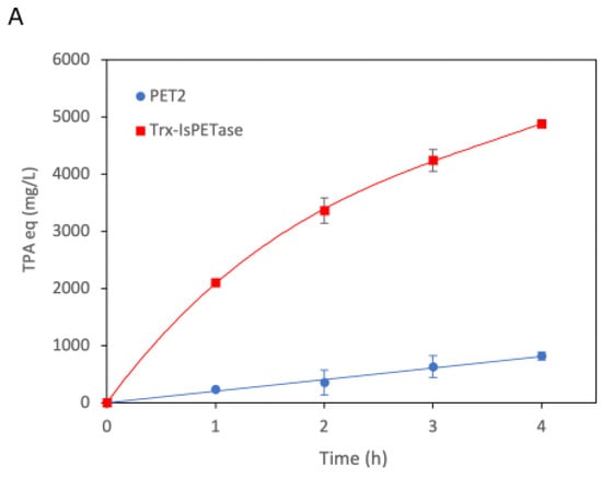 Reaction rates for PET2 and Trx-IsPETase were determined over a period of 4 h. The enzyme concentration was 0.12 g/L, and the substrate was 20 mg PET. The reaction conditions for PET2 were the same as described above, while for Trx-IsPETase were pH 7.4 and 37 °C, as described in our previous work [35]. The samples were taken every hour and analyzed by HPLC.