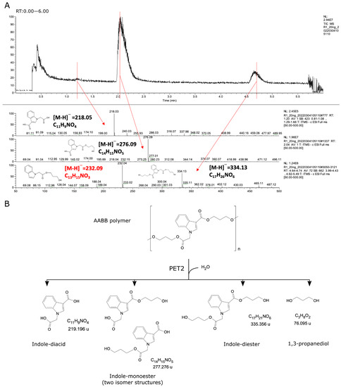 PET2 depolymerization activity on AABB polyester. (A) LCMS analysis of depolymerization products. (B) Proposed reaction based on the LCMS analysis. Notice that the 1,3-propanediol was not analyzed, but it is a predicted product from the AABB molecular structure. The molecule marked in red is not expected to be a main product based on the chemistry.