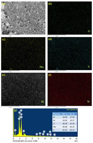 The surface morphology was identified using SEM analysis. Figure 2a,b shows the Bi2WO6 nanoflake bunches under 1 µm and 500 nm magnifications, respectively. The small flakes agglomerated into spherical flowers with different orientations. MoS2 formed small flower petal-like sheets without clustering (Figure 2c,d). Figure 2e,f shows the morphology of the as-prepared nanocomposite under 500 nm magnification. A major portion of the nanocomposite is composed of Bi2WO6 flakes with MoS2 petals between them. This indicates the successful formation of the composite. The samples were subjected to elemental analysis (EDS). A summary of this analysis is presented in Figure 3. Figure 3a shows an image of the sample being analyzed; Figure 3b–f indicate the presence of each element in the composition and its uniform distribution throughout the sample, and Figure 3g shows the quantitative analysis of each element in terms of the weight and atomic percentage. Bismuth and tungsten were the major elements because their input was 10 times greater than that of MoS2. This agrees with the results shown in Figure 2e,f. TEM can provide high-resolution images with fine details. Electron penetration provides a high-dimensional image of the sample. Figure 4a–d show the TEM images of the prepared samples at resolutions of 100, 50, 20, and 10 nm, respectively. The Bi2WO6 flakes and MoS2 sheets became distinctly visible as the magnification increased. The lattice fringes (Figure 4e) with a d spacing of 0.315 nm and 0.62 nm represent (113) lattice plane of orthorhombic Bi2WO6 and hexagonal plane (002) of MoS2. The diffraction spots of the corresponding SAED pattern in Figure 4f indicate the simultaneous presence of Bi2WO6 and MoS2.
