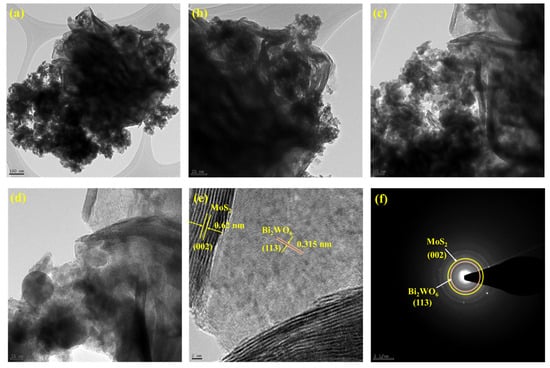 TEM images of Bi2WO6/MoS2 nanocomposite with magnification (a) 100 nm, (b) 50nm, (c) 20 nm, (d) 10 nm, (e) lattice fringe pattern, and (f) SAED pattern.