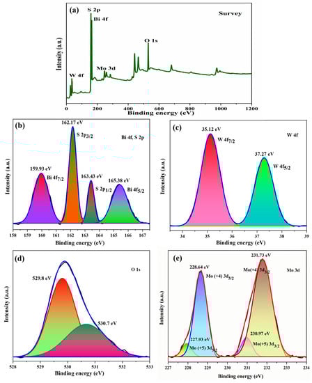 X-ray photoelectron spectroscopy (XPS) is a powerful analytical tool for detecting the chemical composition and electronic structure of materials at the atomic level. The peaks listed in the survey spectrum (Figure 5a) indicate the presence of all constituent elements (that is, Bi, W, O, Mo, and S) in the composite. High-resolution Bi 4f, W 4f, O 1s, Mo 3d, S 2s, and S 2p spectra are presented in Figure 5b–e. The peak positions, attributing elements, and corresponding electronic states are summarized in Table 1. As per the results portrayed in the table, the chemical states of bismuth, tungsten, molybdenum, and sulfur are Bi3+, W6+, Mo4+, and S2−, respectively. Moreover, the new peaks at 227.93 eV and 230.97 eV attributed to Mo+5 oxidation state, which may occur due to S-Mo charge transfer but not due to MoO3 [22]. The peaks of O 1s at 529.8 eV and 530.7 eV correspond to W–O and Bi–O bonds, respectively.