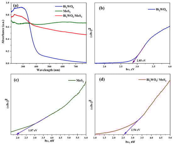 The photocatalytic performance of a material depends on its optical properties, which are usually expressed in terms of bandgap energy. The bandgap energy of the material was calculated based on the UV–vis diffuse reflectance spectra (DRS). The DRS spectra of pristine and composite materials are shown in Figure 6a. The light-harvesting capacity of Bi2WO6 is poor in the visible region. However, when coupled with MoS2, the capacity considerably improved. The bandgap energies of pure Bi2WO6 is 2.85 eV (Figure 6b), and that of MoS2 is 1.87 eV (Figure 6c). The value for the composite was 2.54 eV.