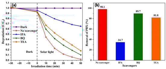 The intrinsic mechanism of the process was investigated. When light is incident on a photocatalyst, the electrons are excited and move to the conduction band, leaving behind holes in the valence band. These electrons and holes interact with the surrounding water molecules and generate free radicals, which in turn degrade organic pollutants. This is the typical mechanism for pristine photocatalysts. However, in the composites, these electrons and holes migrate from one energy level to another to balance the overall electric potential. Based on their migration path and final positions, they generate free radicals that actively participate in the reaction. These free radicals can be identified by examining the various trapping agents. In this study, triethanolamine (TEA), p-benzoquinone (BQ), and isopropyl alcohol (IPA) were used to trap holes and superoxide and hydroxyl free radicals. The degradation studies were repeated by adding these agents to determine their effects. Figure 8 shows the results of these studies. The addition of BQ and TEA did not have a considerable effect on the process, whereas the impact of IPA is distinctly visible in Figure 8. This indicates the critical role of hydroxyl free radicals in xanthate degradation. Hydroxyl is the most reactive species compared to others due to its high reduction potential of 2.8 V. It attacks rapidly with a high rate constant [28]. Therefore, the degradation rate was extremely high, resulting in complete removal within 50 min.