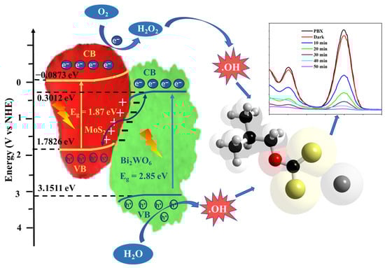 The identification of the exact band-edge position is also important for investigating the electron and hole migration pathways and the corresponding free-radical generation. The band-edge positions were calculated using the standard procedure presented in the literature [29]. Additionally, the valence band (VB) and conduction band (CB) potentials are measured using the empirical formulae: EVB = χ − Ee + (0.5) Eg; ECB = EVB − Eg. Where EVB and ECB are the VB and CB potentials, respectively. χ is the electronegativity of the semiconductor; for Bi2WO6 and MoS2, the χ values are 6.23 and 5.35 eV, respectively. Eg and Ee refer to the bandgap energy and energy of free electrons on the hydrogen scale (~4.5 eV), respectively. The values for pristine Bi2WO6 are 0.3012 and 3.1511 eV, and those for MoS2 are −0.0873 and 1.7826 eV. As seen from the band-edge positions depicted in Figure 9, the highest conduction band value is for MoS2, that is, −0.0873 eV. Since it is less than −0.33 eV vs. NHE (standard reduction potential), the production of superoxide radicals is not possible; however, it is sufficient to produce hydroxyl radicals [30]. This is in agreement with the results of the scavenger studies. Similarly, only Bi2WO6 exhibits a redox potential (EVB = 3.1511 eV; E(OH−/•OH = 1.96 eV) to produce •OH radicals. If the charge transfer is a Type II mechanism, holes must migrate from the VB of Bi2WO6 to that of MoS2 and directly participate in the degradation process; however, this contradicts the results from the scavenger studies. In addition, the energy gap between the valence band of MoS2 and the conduction band of Bi2WO6 was small (1.4815 eV). When Bi2WO6 and MoS2 join, the free electrons of MoS2 flow to those of Bi2WO6 to balance the Fermi level [31]. Therefore, the MoS2 side was positively charged, and the Bi2WO6 side was negatively charged at the interface, resulting in a built-in electric field. The photogenerated electrons in the CB of Bi2WO6 could easily join the holes in the VB of MoS2. This Z-scheme improves the separation efficiency of electrons and holes, producing highly active catalysts. This extended life of the free radicals improves the effective breakdown of PBX. Therefore, the as-prepared heterojunction completely degraded the PBX in 50 min.