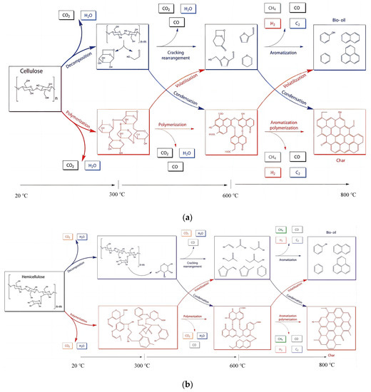 Pyrolysis pathways of (a) cellulose, (b) hemicellulose, and (c) lignin at different temperatures [31].