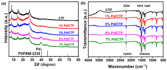 X-ray powder diffraction (XRD) and Fourier transform infrared (FT-IR) spectra were recorded to probe the composition and chemical structure of Pd/CTF catalysts. The XRD patterns of Pd/CTF and CTF are shown in Figure 3a. Both CTF and Pd/CTF samples showed the diffraction peaks at 7.6°, 14.4°, 15.4° and 26.6°, correspond to , , , and crystal planes, respectively. The two broad characteristic peaks at 14.4° and 26.6° correspond to the long-range in-plane molecular ordering of triazine-based polymers and the interlayer packing of π-conjugated aromatic structures, respectively [39,40,41,42]. The major structure of CTF is still retained after Pd loading treatment. In comparison with pristine CTF, the XRD patterns of Pd/CTF sample also presented the peaks at 39.8°, 46.0°, and 68.1°, corresponding to the (111), (200), and (220) planes of cubic Pd (JCPDS No. 88-2335), respectively. In addition, no obvious diffraction peaks of KCl, LiCl, and ZnCl2 were observed for both CTF and Pd/CTF catalysts, suggesting that KCl, LiCl, and ZnCl2 have been completely removed after the washing process.