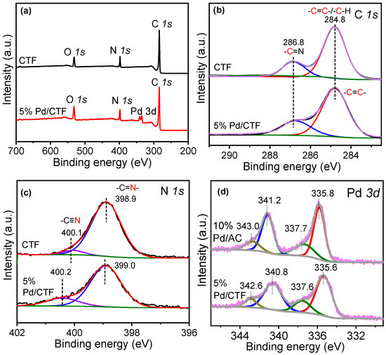 Additionally, the Pd 3d spectra for Pd nanoparticles on CTF can be resolved into two spin-orbit pairs with 3d3/2 binding energies of 342.6 eV and 340.8 eV, and with 3d5/2 binding energies of 337.6 eV and 335.6 eV, respectively (Figure 4d). The peaks at 342.6 eV (Pd 3d3/2) and 337.6 eV (Pd 3d5/2) are attributed to Pd2+, while the peaks at 340.8 eV (Pd 3d3/2) and 335.6 eV (Pd 3d5/2) are attributed to Pd0. It is noted that the peaks at 340.8 eV (Pd 3d3/2) and 335.6 eV (Pd 3d5/2) attributing to Pd0 for 5% Pd/CTF show down shift of 0.2–0.4 eV when compared with those of 10% Pd/AC. A similar shift can also be observed from supported catalysts in other reports, confirming the electron transfer between support and catalyst [48,49,50].