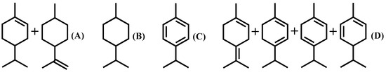 - Roberge, D.M.; Buhl, D.; Niederer, J.P.M.; Hölderich, W.F. Catalytic aspects in the transformation of pinenes to p-cymene. Appl. Catal. A Gen. 2001, 215, 111–124. [Google Scholar] [CrossRef]