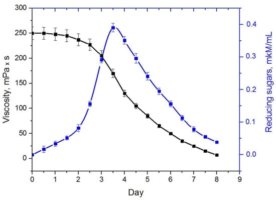 Time course of xanthan depolymerization from the microbial preparation with the highest potential during the growth in a liquid XP medium. Samples were taken and assayed for cell viscosity and changes in reducing sugars. Viscosity (black line) was measured with an LVF Brookfield viscosimeter at 22 °C. Reducing sugars (blue line) were assayed by the method [41]. Bars indicate standard errors.