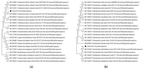 Phylogenetic trees constructed for the selected strains of KG3 and KG5 are based on 16S rRNA gene sequences. The trees with the highest log likelihood (−4296.27 (a); −5204.00 (b)) are shown. The percentage of trees in which the associated taxa clustered together is shown next to the branches. Initial tree(s) for the heuristic search were obtained automatically by applying Neighbor-Join and BioNJ algorithms to a matrix of pairwise distances estimated using the Tamura-Nei model and then selecting the topology with the superior log likelihood value. This analysis involved 21 nucleotide sequences. There were a total of 1535 (a) and 1563 (b) positions in the final dataset. Evolutionary analyses were conducted in MEGA X [43].