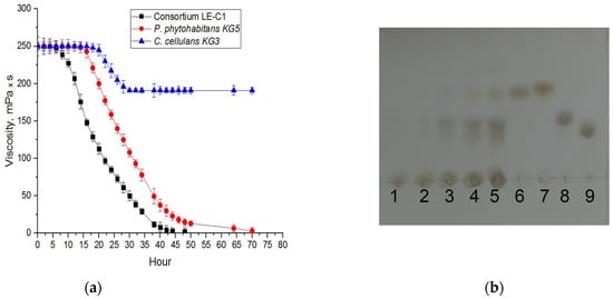 Comparison of the specific activities assayed after the growth of P. phytohabitans KG5 and C. cellulans KG3 and their consortium LE-C1 in XP medium revealed the different impacts of the particular enzymes of each microorganism in the overall xanthan-depolymerizing ability of the consortium (Table 1). These results were somewhat surprising because along with the overall positive effect of the LE-C1 consortium on xanthan depolymerization (Figure 3a), we observed a noticeable decrease in the specific enzyme activities of the C. cellulans KG3 strain in the consortium compared to its individual growth in XP medium (Table 1). This can be explained by different sets of enzymes synthesized by each microorganism in the mix that regulate the action of each component.