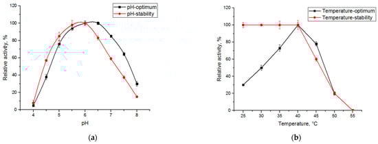 Effects of pH and temperature on the xanthanase activity and stability of the enzyme complex produced by the LE-C1 consortium. Xanthanase activity was measured following the accumulation of reducing sugars by the method [41]. To determine the optimal pH ((a) panel, black line), xanthanase activity was assayed using citrate–phosphate (pH 3.0–7.6) and Tris-HCl (pH 8.0–9.0) buffer solutions at 40 °C. To check the pH stability ((a) panel, red line), the samples were preincubated at various pH values (pH 3.0–9.0) at room temperature for 24 h followed by a standard activity assay. To determine the optimum xanthanase temperature, enzyme activity was measured at various temperatures (4 °C, 25–60 °C) and pH 6.0 ((b) panel, black line). Thermostability of the consortium xanthanase was evaluated after preincubation of the liquid broth samples at various temperatures and pH 6.0 for 15 min ((b) panel, red line). The highest values were taken as 100%.