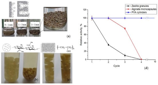 Immobilization of LE-C1 consortium cells by three techniques. (a): immobilized cells of the LE-C1 consortium by adsorption on zeolites with granule sizes of 0–1 mm, 1–3 mm, 3–5 mm. (b): alginate beads with immobilized LE-C1 cells (freshly prepared microcapsules are shown on the left and after four working cycles on the right). (c): immobilized LE-C1 cells in a PVA cryogel (left: freshly prepared cylinders and right: after 10 working cycles). (d): working capacity of biocatalysts: the number of working cycles for the LE-C1 consortium immobilized by adsorption on zeolite granules 0–1 mm in size (black line), in alginate microcapsules (red line), and in PVA cryogel (blue line). The activity of the catalyst in the 1st cycle was taken as 100%.