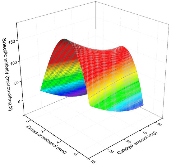 where, X represents the excess of methanol measured in mol, Y is the catalyst amount in mg, and Z is the specific activity in micromol mg−1 h−1. The coefficients obtained after fitting were with coefficients and .